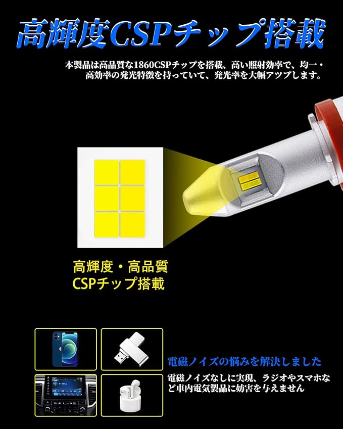 高輝度 高品質なCSP1860チップ採用、均一 高効率の発光特徵を持って、発光率が大幅にアップ! ホワイトは6000K、