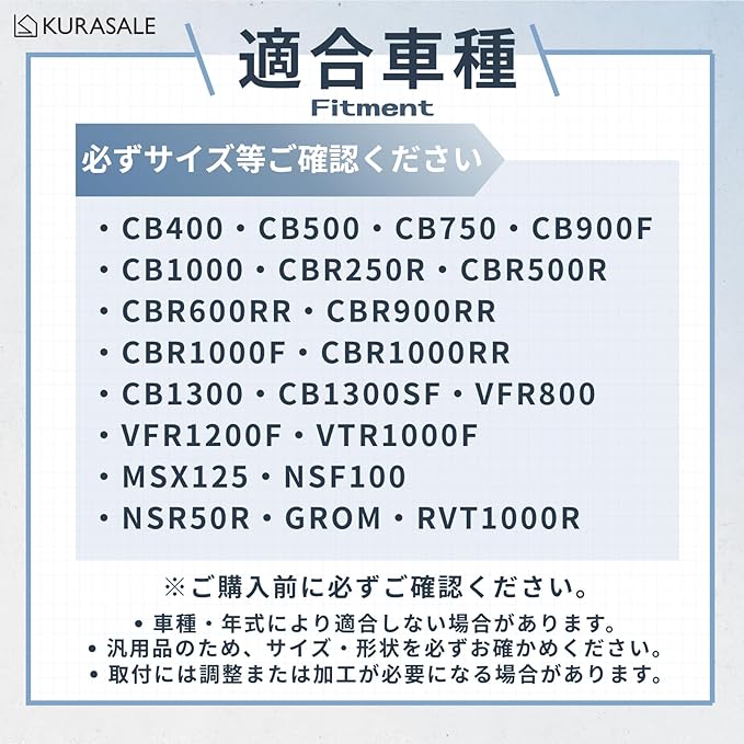 ✅適合車種(汎用タイプ)※必ず商品ページ・サイズも併せてご確認ください。 CB400/CB500/CB750/CB900F/CB1000/CBR250R/CBR500R/CBR600RR/CBR900RR/CBR1000F/CBR1000RR/CB1300/CB1300SF/VFR800/VFR1200F/VTR1000F/MSX125/NSF100/NSR50R/GROM/RVT1000R