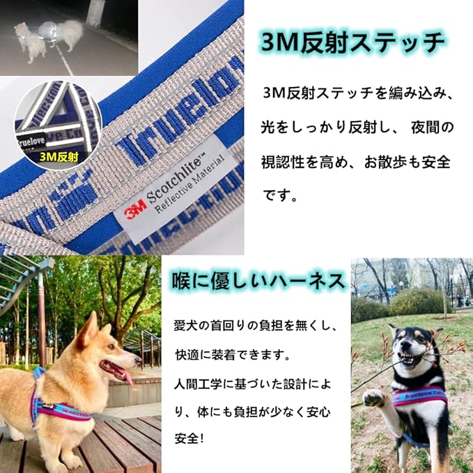 3M反射ステッチ:ハーネスはかわいいだけでなく、夜になると反射するので、暗い夜道でも目立ちます。入射した方向に対して集中的に反射するため、ライトに照らされると、遠くからでもよく見えます。