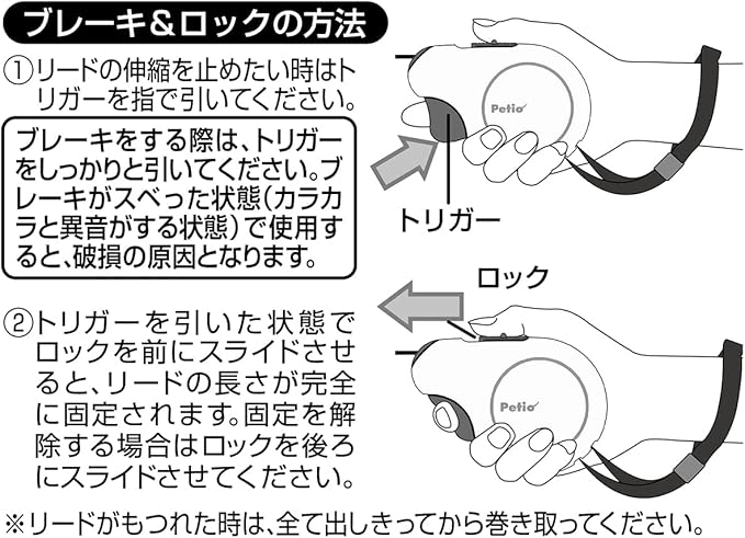 〈ブレーキ&ロックの方〉①リードの伸縮を止めたい時はトリガーを指で引いてください。ブレーキをする際は、トリガーをしっかりと引いてください。ブレーキがスベった状態(カラカラと異音がする状態)で使用すると、破損の原因となります。②トリガーを引いた状態でロックを前にスライドさせると、リードの長さが完全に固定されます。固定を解除する場合はロックを後ろにスライドさせてください。※リードがもつれた時は、全て出しきってから巻き取ってください。