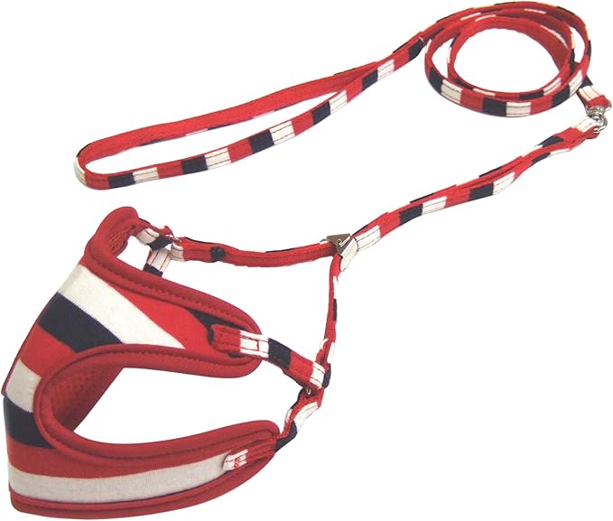 お洒落なボーダー柄をプリントしたコットン生地と、内側にメッシュ加工したナイロン生地を使用し、通気性の良いソフトなハーネスとリードが一体になっているので、お散歩に便利です。