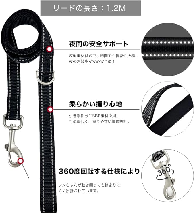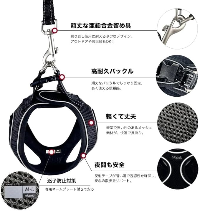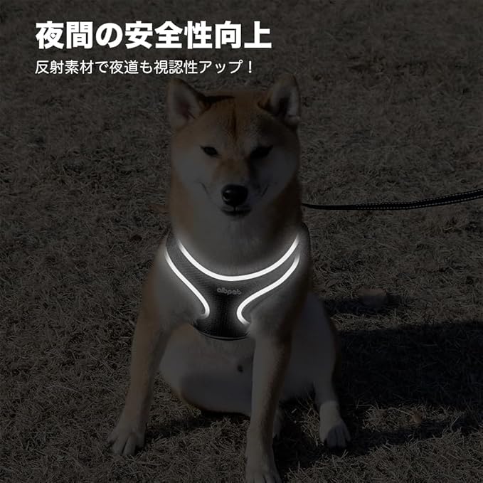 【快適性と安心】柔らかいメッシュ生地を使用しているため、引っ張られても痛みを感じにくいデザインです。また、反射テープが配置されているため、夜間の視認性と安全性が確保されます。夜の散歩が多い場合でも、車のライトなどに反射して非常に役立ちます。