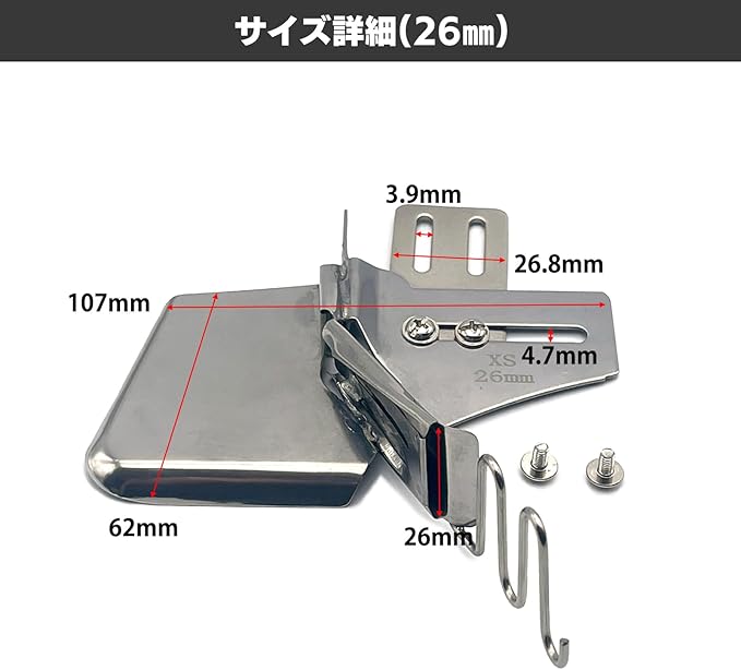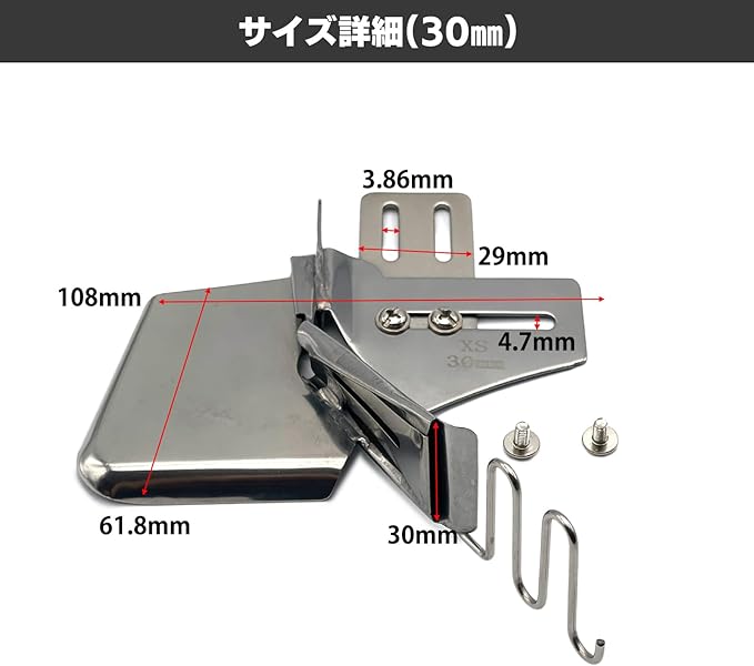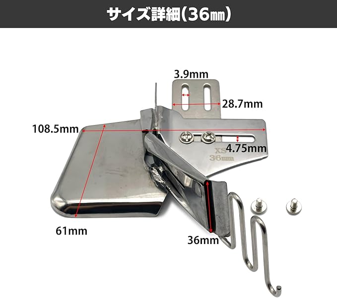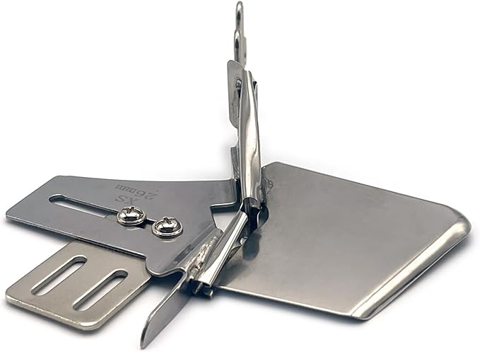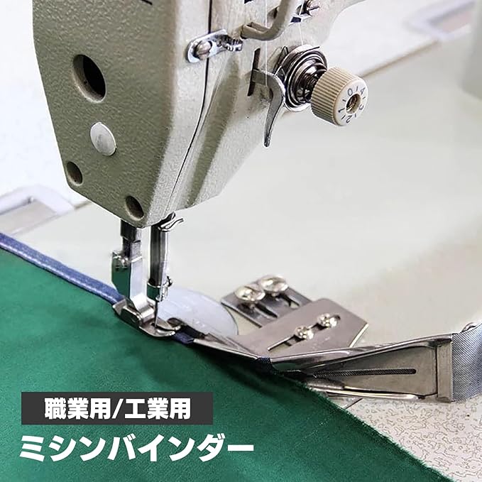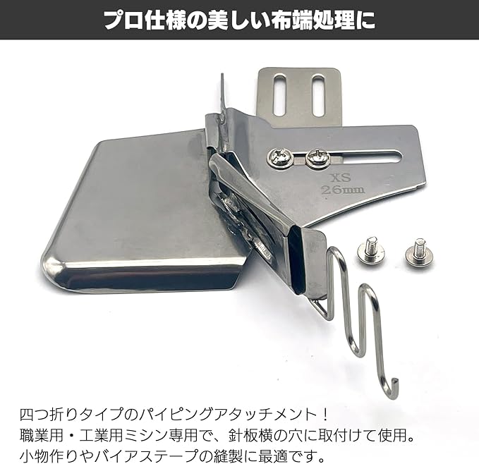 パイピングアタッチメント。職業用・工業用ミシン専用の四つ折りタイプのミシンバインダーです。針板横の穴に取り付けて使用することで、布端を美しく処理でき、小物作りやバイアステープ縫製に最適です。