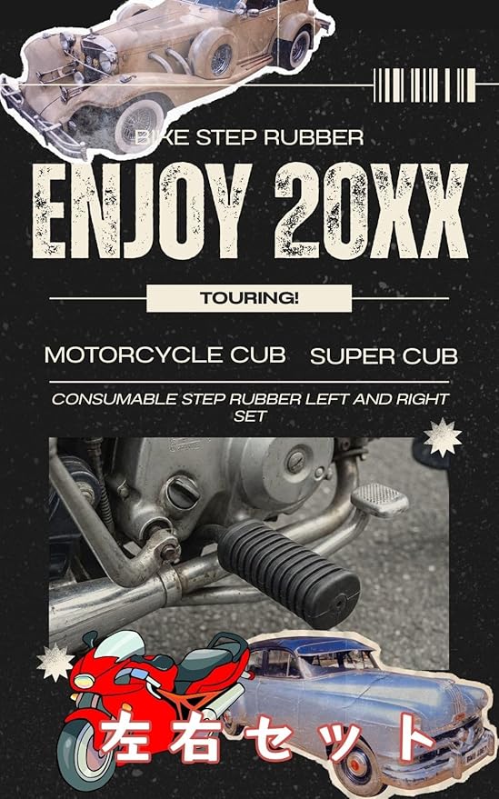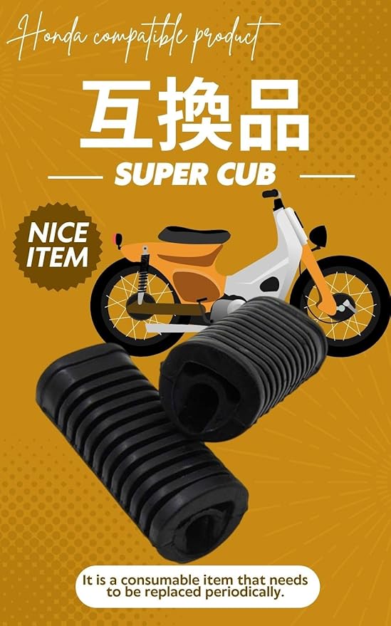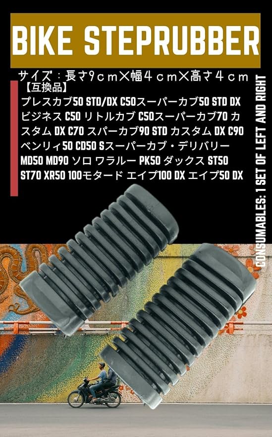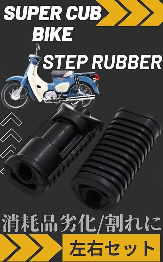 スーパーカブ互換品のバイクステップラバー左右セットです。経年劣化や摩耗や割れによる消耗品のカブステップラバーは、潤滑油を少量ぬりゴムハンマー等で簡単に設置していただけます。ステップ外側のゴムが切れていたたや転倒時の割れや削れ、時間経過による劣化など二輪愛用家に使いやすい消耗品です、スーパーカブに乗る際に必要なバイクグッズです。