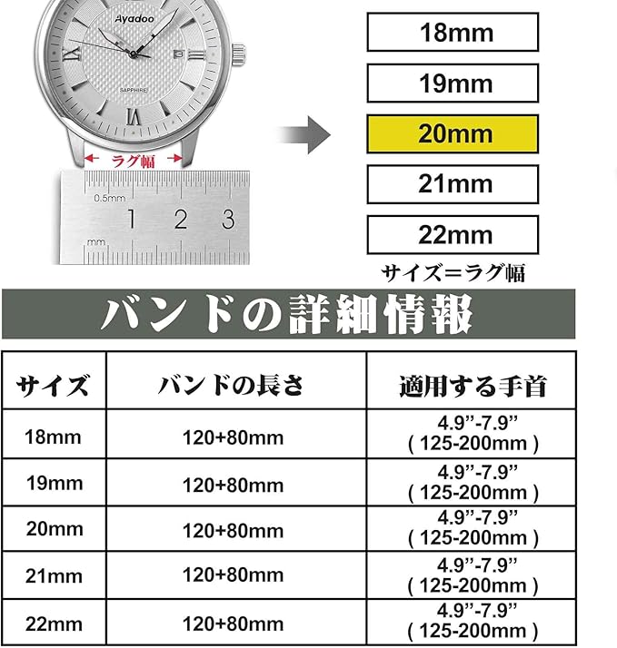 バンドのサイズ:この時計バンドはクイックリリーススプリングバーを使用する18mm、19mm、20mm、21mm、22mmの従来型またはスマートウォッチに適します。サイズ=ラグ幅
