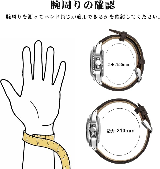 バンドの長さは 125mm / 75mm (バックルを除く)です。腕周長165mm-205mmの方に適用しますが、腕時計のダイヤルも影響します。