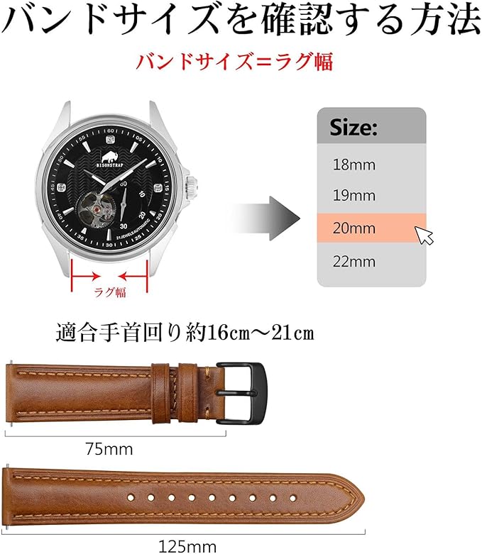 【サイズ】ラグ幅18mm/19mm/20mm/22mmの腕時計やスマートウォッチに適用します。バンド長さは75mm/125mm(尾錠を含めず)、ご注文する前にご確認ください。