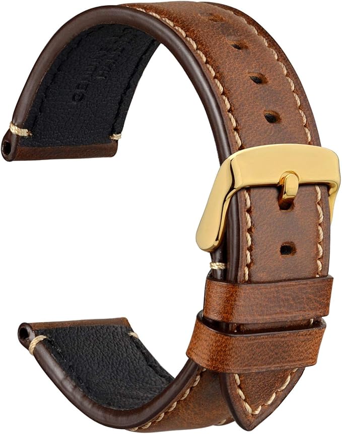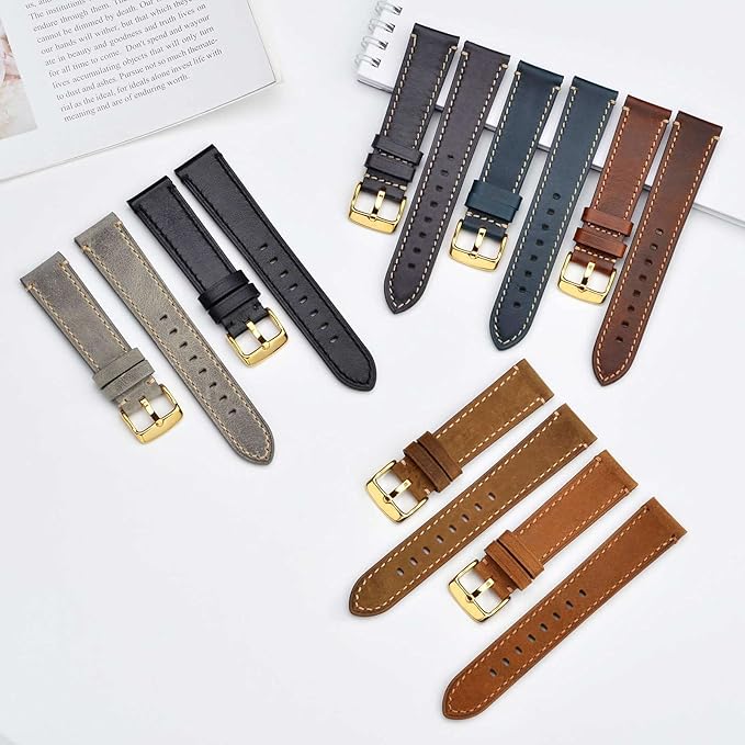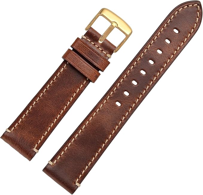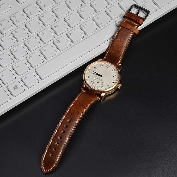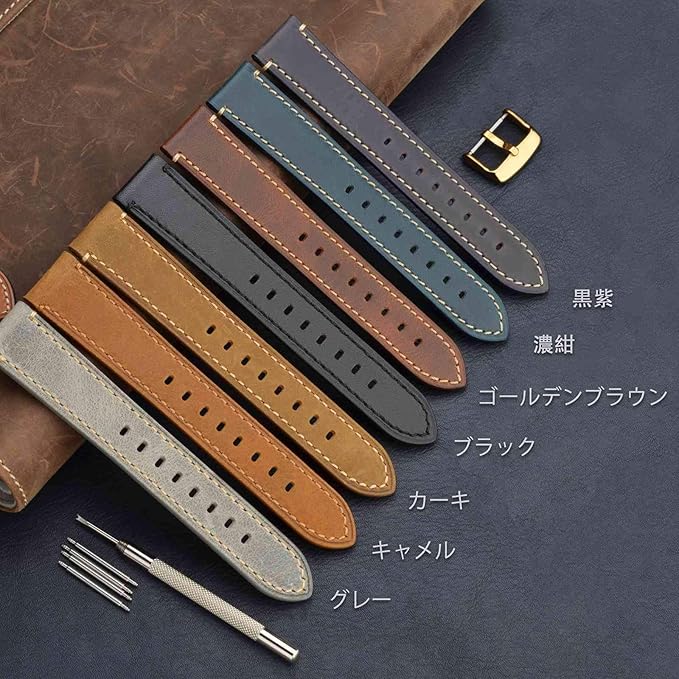 高品質なクレージーホースレザー(crazy hose leather)を使用しています。自然な状態では茶色になってますが、ベルトを曲げると本革特有な筋が出てきます。ステッチされていて頑丈で耐久性があり、質感、縫製が優良な復古風腕時計ベルトです。