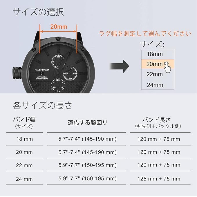 この時計バンドは幅20mm のバネ棒(スプリングバー)を使う伝統的な腕時計やスマートウォッチに適用します。注文する前に腕時計ダイヤルのラグ幅をご確認ください。