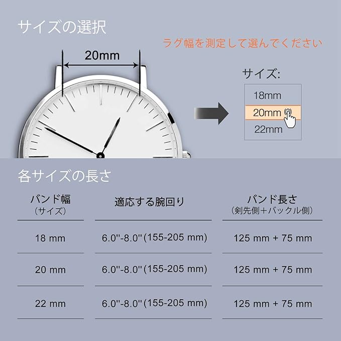 この時計バンドは幅18mmのバネ棒(スプリングバー)を使う腕時計やスマートウォッチに適用します。注文する前に腕時計のラグ幅を御確認ください。