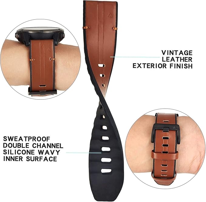 【防汗波と通気性のあるデザイン】ストラップの内側は、肌にやさしく柔らかな非アレルギー性シリコン素材で、運動や汗をかいてもムレを感じさせないウェーブテクスチャーデザインです。 ストラップの外側はクラシックでエレガントなレザーで、スマートウォッチを引き立てます。