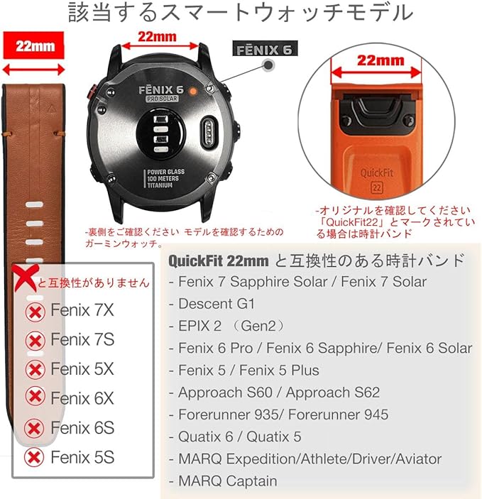 【該当するモデル】 スマートウォッチの背面にマークされているモデルを確認してください。QuickFit22mmストラップは、Fenix 8 47mm, epix Pro 47mm,Fenix 5/Fenix 5 Plus, Fenix 6/Fenix 6 Pro/Fenix 6 Sapphire,Quatix 6/Quatix 5,Approach S60/Approach S62 / S70 47mm ,Forerunner 935/Forerunner 945,MARQ Expedition/Athlete/Driver/Aviator/Captain/Golfer。 このストラップは、オリジナルのストラップに「QuickFit22mm」のマークが付いている他のGarmin時計にも適しています。