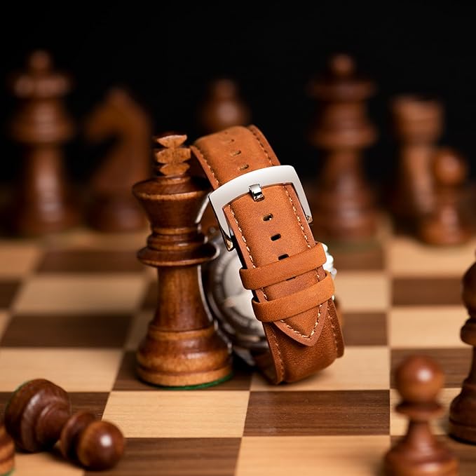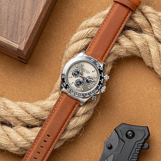 ヴィンテージスタイル、クレイジーホースレザーとダークヌバック: 厳選された最高級のクレイジーホースレザーは、革を曲げると自然にひび割れが生じます。時間の経過とともに自然な風合いが生まれますが、こうした単純な欠陥がどんな時計にも豊かな質感を加えます。裏側にはダークブラウンのヌバックライニングを施し、肌触りが非常に柔らかく、滑りを最小限に抑えながら理想的な快適さを提供します。この組み合わせにより、エレガントでクラシックなレトロスタイルが生まれ、手首に快適に着用できます。