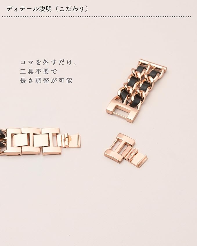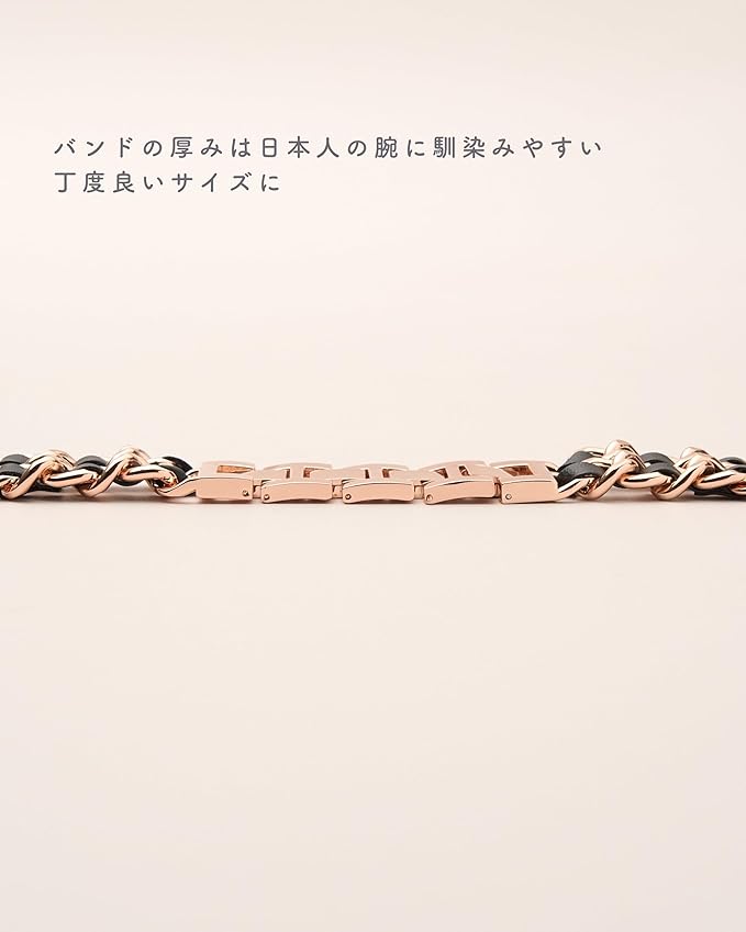 【チェーン仕様で通気性に優れ快適な着け心地】女性がアクセサリー感覚で身につけられるステンレスバンドをコンセプトに、本革を編み込んだチェーンデザインで別注を行いました。チェーン仕様で通気性に優れているため蒸れにくく快適なつけ心地を実現。従来通り手首周りに合わせてお使いただいたり、アクセサリー感覚で少し緩めにサイズ調整をしお使いただくのもおすすめです。