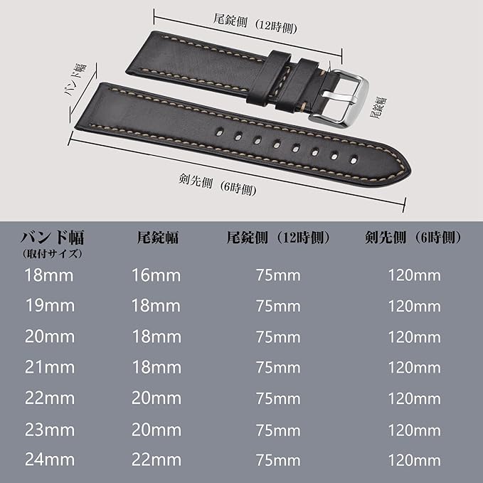 【サイズ】バンドの長さは125mm / 75mm (尾錠を除く)です。八つ穴があり、適合手首の長さは155-210mmです。詳細寸法について、サイズ表をご参照ください。