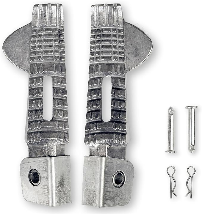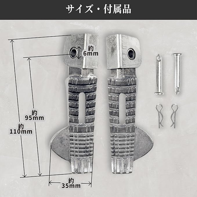 【サイズ・付属品・バリエーション】 全長約110mm/幅約35mm/取付穴径約6mm。固定用ピン・スナップピンが付属し、届いてすぐに交換可能です。①左右セット②右のみ③左のみの3種類をご用意しています。
