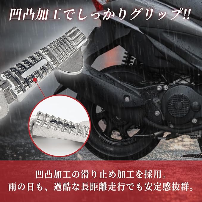 【滑り止め加工で安全性向上】 ステップ表面に凹凸加工を施し、靴底がしっかりと噛み合う仕様です。タンデム走行時でも足元が安定し、同乗者の安全性を高めます。経年劣化による性能低下の改善にも効果的です。