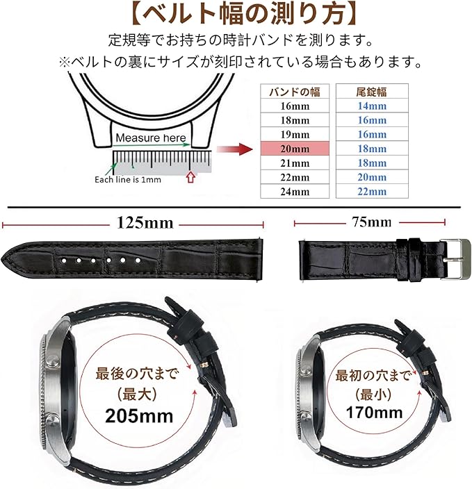 ✅【サイズ】バンドの幅: 22mm、尾錠幅: 20mm。剣先側長さ:125mm、親側長さ:75mm。厚さ:2mm。理想の手首サイズ:170〜200mm。