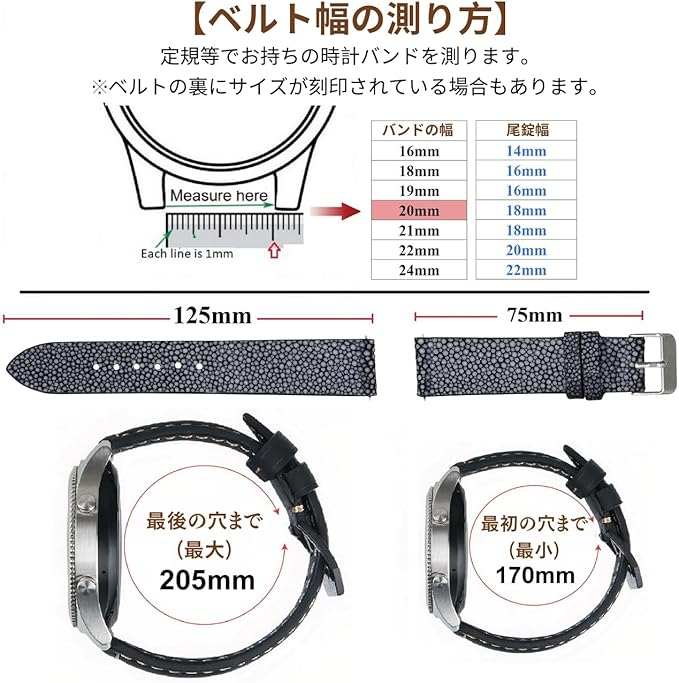 ✅【サイズ】バンドの幅: 22mm、尾錠幅: 20mm。剣先側長さ:125mm、親側長さ:75mm。理想の手首サイズ:170〜200mm。