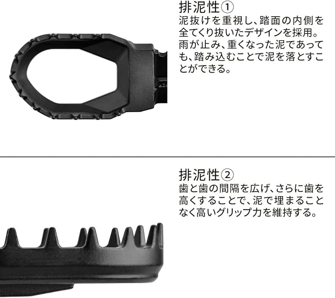 泥抜けを重視し、踏面の内側を全てくり抜いたデザインを採用。雨が止み、重くなった泥であっても、踏み込むことで泥を落とすことができる。