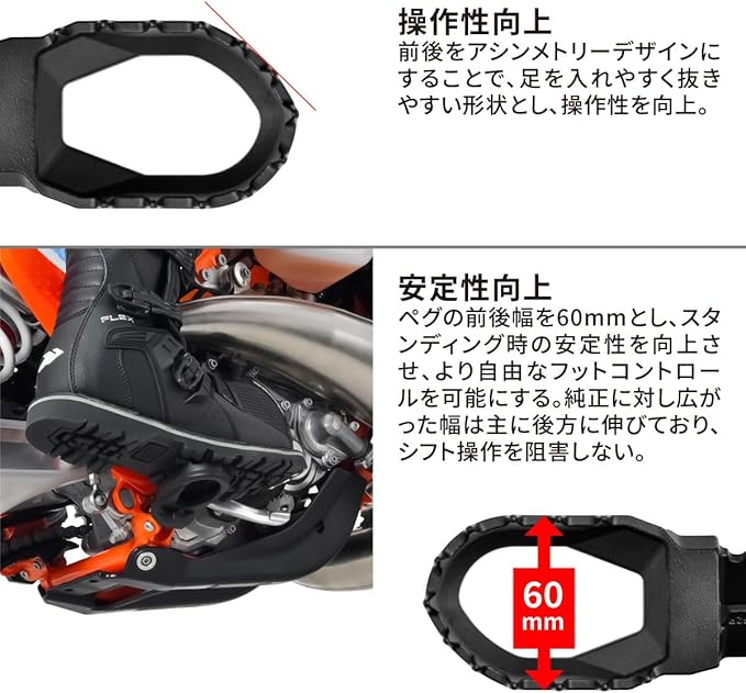 ペグの前後幅を60mmとし、スタンディング時の安定性を向上させ、より自由なフットコントロールを可能にする。純正に対し広がった幅は主に後方に伸びており、シフト操作を阻害しない。