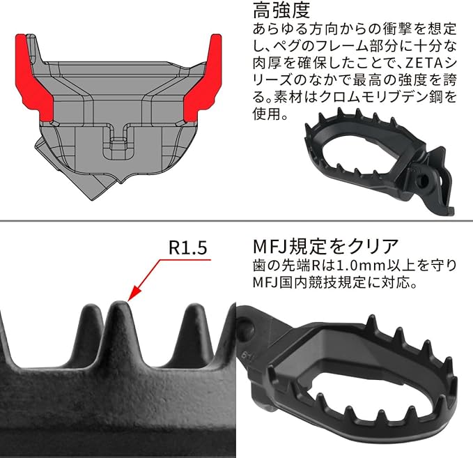 あらゆる方向からの衝撃を想定し、ペグのフレーム部分に十分な肉厚を確保したことで、ZETAシリーズのなかで最高の強度を誇る。素材はクロムモリブデン鋼を使用。歯の先端Rは1.0mm以上を守り、MFJ国内競技規定に対応。