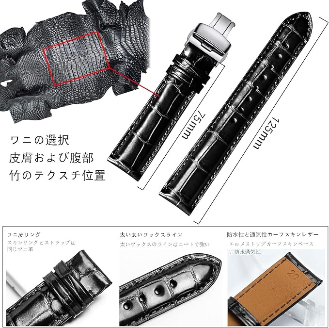 ⭐【天然ワニ革】高品質の本物のクロコダイルレザーを使用したハンドメイド。繊細な質感のクリア。粒子素材は通気性、防水性、耐汗性があり。 自然のワニの肌の質感は人間の指紋と同じように独特なので、ストラップの質感は写真の画像と少し異なる場合があります。