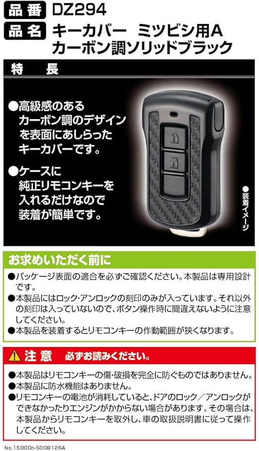 商品紹介 ・三菱純正リモコンキー(スマートキー)専用カバー 本製品は三菱純正リモコンキー(スマートキー)専用のキーカバーです。 オススメ車種:※R3(2021)年12月現在ニッサン デイズ (H25.6~H31.3 ) B21W ニッサン デイズルークス (H26.2~R2.3 ) B21A ミツビシ eKカスタム (H25.6~H31.3 ) B11W ミツビシ eKクロス (H31.3~ ) B34W/B35W/B37W/B38W ミツビシ eKスペース (H26.2~R2.3 ) B11A ミツビシ eKワゴン (H25.6~H31.3 ) B11W ミツビシ eKワゴン (H31.3~ ) B33W/B36W ミツビシ i (H18.1~H30.4 ) HA1W/HA3W/HA4W系 ミツビシ RVR (H22.2~ ) GA#W系 ミツビシ アウトランダー (H24.10~ ) GF#W/GG#W系 ミツビシ エクリプスクロス (H30.3~ ) GK1W/GK9W/GL3W ミツビシ デリカD:5 (H19.1~ ) CV#W系 ミツビシ ミラージュ (H24.8~ ) A03A/A05A ※グレード・年式等でリモコンキーの種類が異なる場合があります。お持ちのリモコンキーが画像と同じ形かご確認ください。 ※上記にない車種でもリモコンキーのタイプ(形)が同じであれば装着可能です。 ・簡単装着 本製品はコインでケースとカバーを外し、リモコンキー(スマートキー)を入れてカバーを取り付けるだけで簡単にお使いいただけます。 ・大人の装いカーボン調デザイン&ソリッドブラック リモコンキーを傷から守りながら、カーボン調&ソリッドブラックでリモコンキーを大人の装いに変えることができます。 ・ロックアンロックの刻印入り 本製品には、ロックとアンロックの刻印が入っています。 ※ロック・アンロック以外の刻印は入っていません。ボタン操作時に間違えないように注意してください。 ●必ずお読みください -注意- ・本製品はリモコンキーの傷・破損を完全に防ぐものではありません。 ・本製品に防水機能はありません。 ・リモコンキーの電池が消耗していると、ドアのロック/アンロックができなかったりエンジンがかからない場合があります。その場合は、本製品からリモコンキーを取り外し、車の取扱説明書に従って操作してください。・本製品は専用設計です。使用可能(適合型)かどうかを必ずご確認ください。 使用上の注意 ●本製品はリモコンキーの傷・破損を完全に防ぐものではありません。●本製品に防水機能はありません。●リモコンキーの電池が消耗していると、ドアのロック/アンロックができなたかったりエンジンがかからない場合があります。その場合は、本製品からリモコンキーを取外し、車の取扱説明書に従って操作してください。 安全警告 本製品は専用設計です。使用可能(適合型)かどうかを必ずご確認ください。 続きを見る