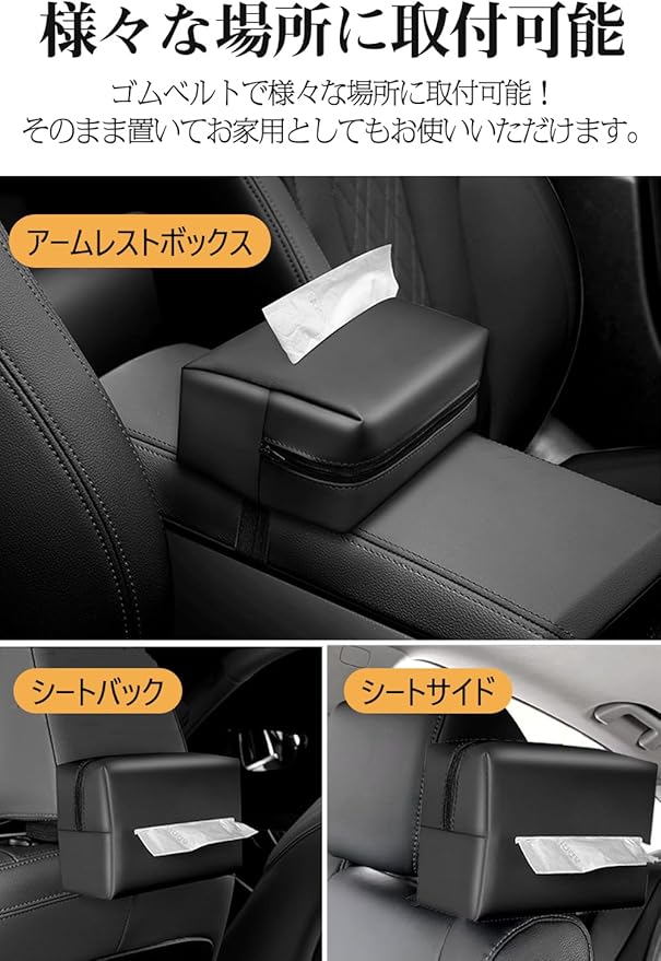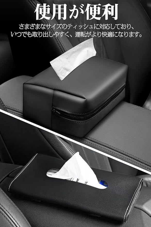 【使い勝手が良い】このティッシュケースは調整可能なバンドが付属し、工具不要でアームレストに縦置きしてバンドで簡単に固定できます。簡単にティッシュを取れるため、便利です。また、ジュースやお菓子で汚れてもカバーはウェットティッシュで簡単に拭き取れます。