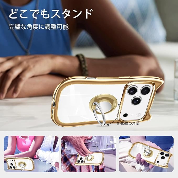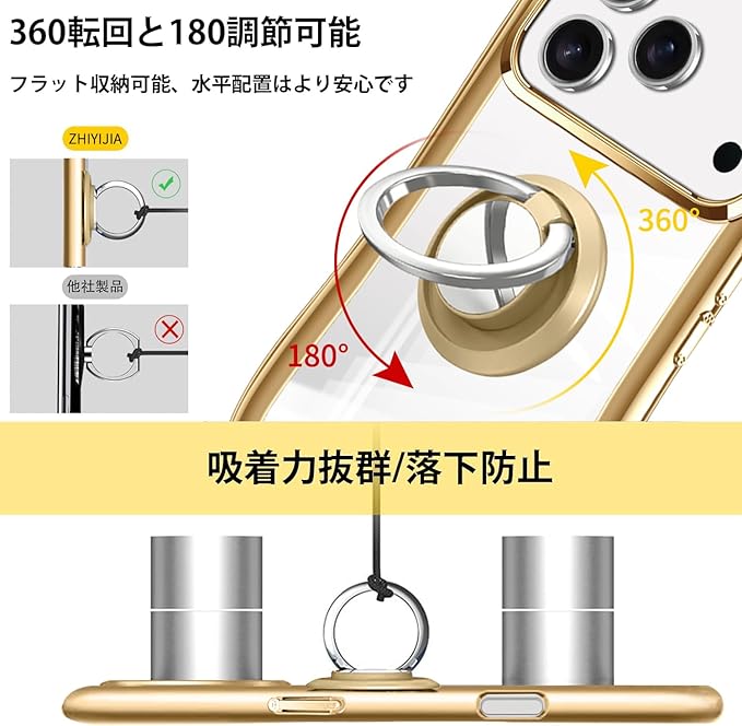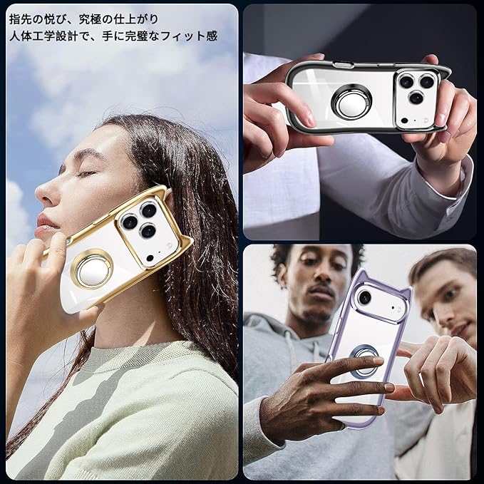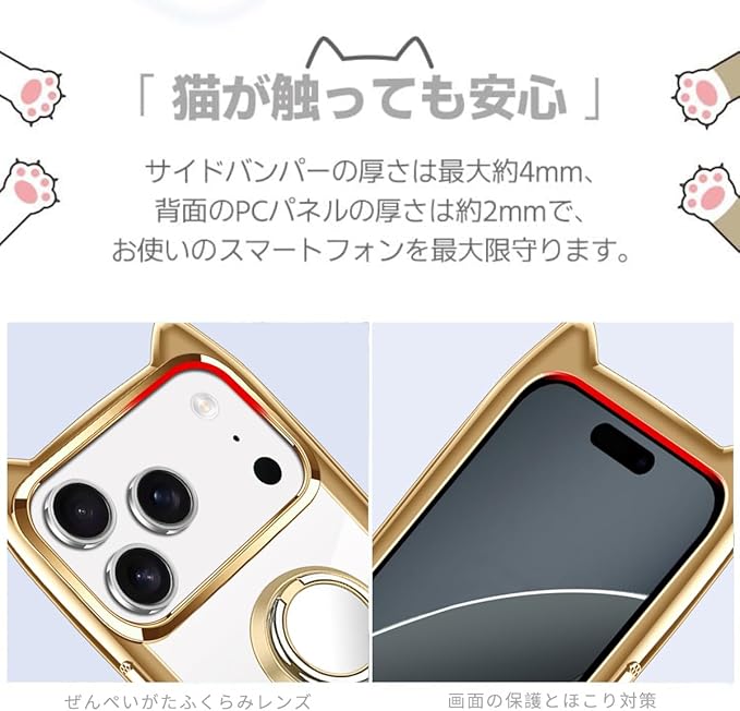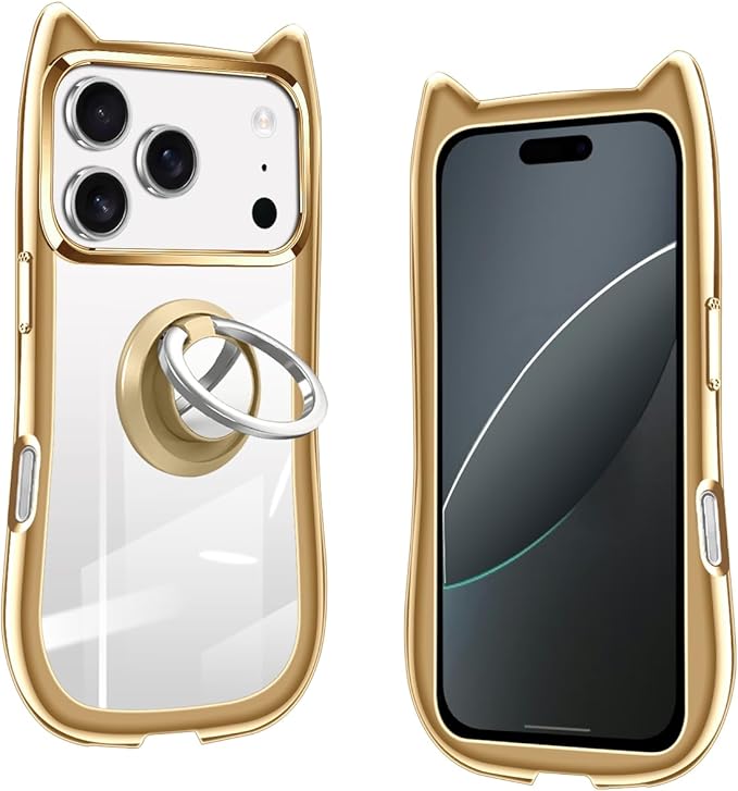 for iPhone 17 Pro Max 専用 ケース クリア カバー TPU 猫耳 リング付き リングホルダ かわいい おしゃれ スタンド付き ストラップホール アイフォン17プロマックス スマホケース 多機能 全面保護 落下防止(ゴールド) | KAZESHOP