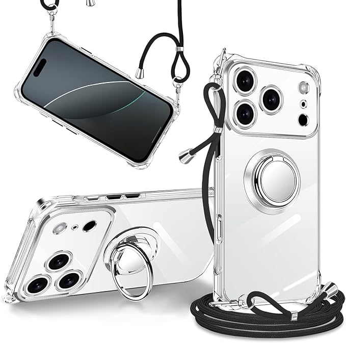 For iPhone 17 Pro Max 用 ケース クリア 透明 リング付き スタンド機能 調節可能な ストラップ付き ショルダー TPU シリコン アイフォン 17 プロ マックス カバー 対応 肩がけ 首掛け 紐付き スマホケース ストラップホール付き 耐衝撃 全面保護 カバー (クリア) | KAZESHOP