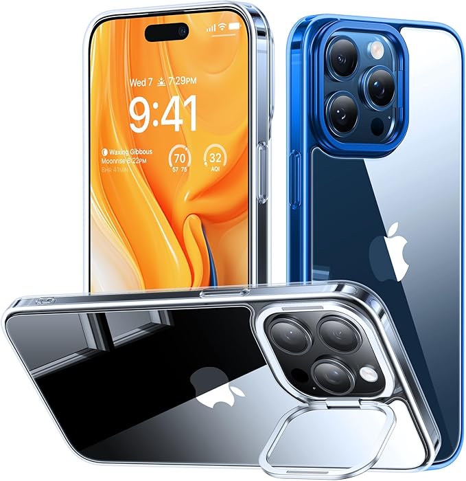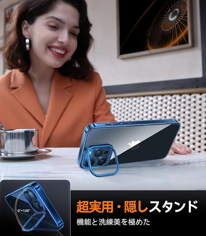 【ダイヤ級クリア・隠しスタンド】TORRAS iPhone 15 Pro Max 用 ケース 強化ガラス カメラスタンド 黄変防止 9H硬度 米軍規格 薄型 ストラップホール付き レンズ保護 6.7インチ UPRO Lstand 氷面鏡 ブルー | KAZESHOP