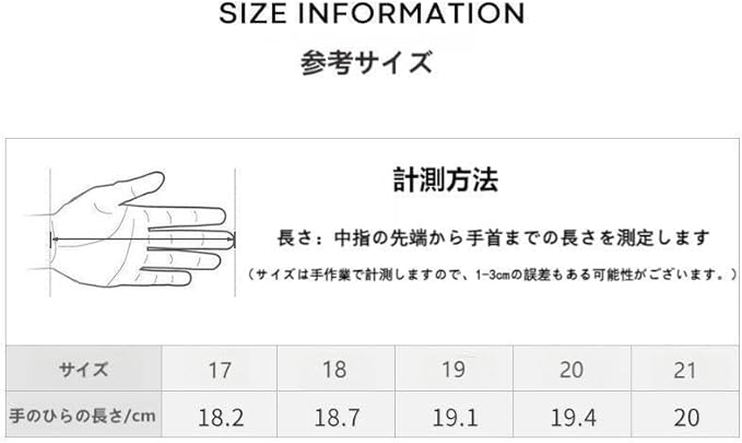 (計測方法 長さ:中指の先端から手首までの長さを測定します。)