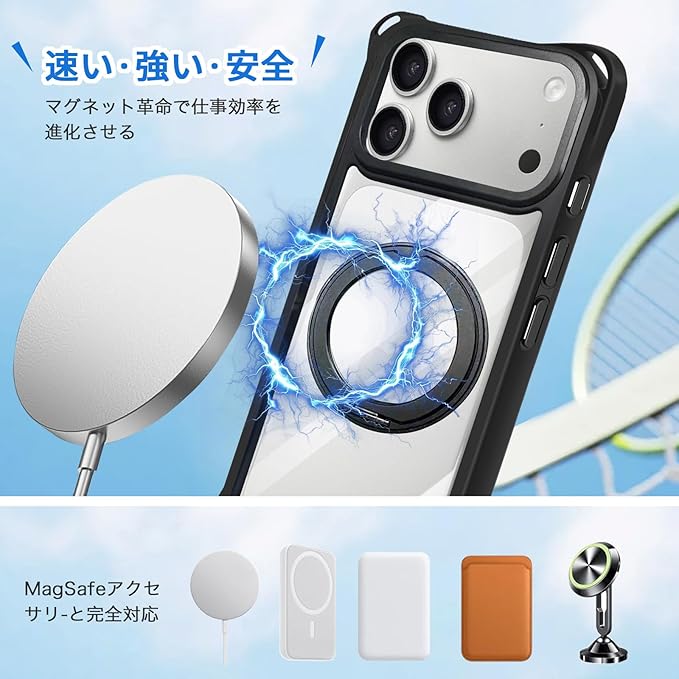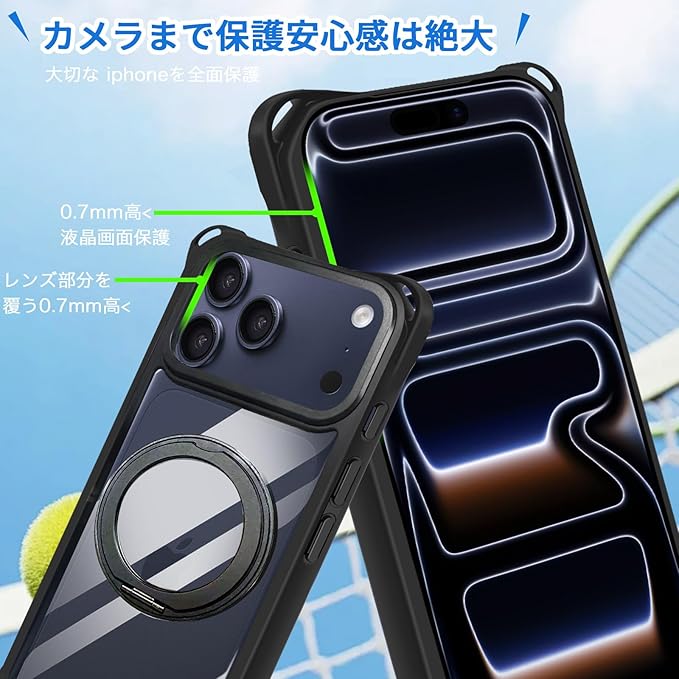 iPhone 17 Pro Max 用の ケース Magsafe対応 ワイヤレス充電 ショルダー クリア リング付き いphone 17 Pro Max 用の 肩掛け 斜めがけ 付き 縦/横 調節可能なショルダー トーラスホルダ スタンド機能 アイフォン 17 Pro Max 用の 360 回転 スマホケース ブラック | KAZESHOP