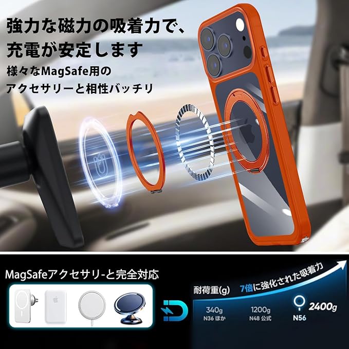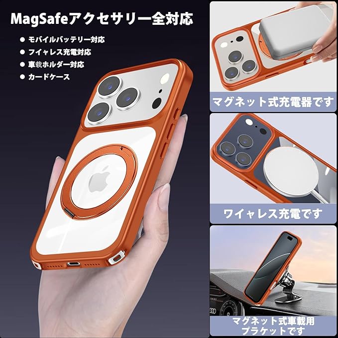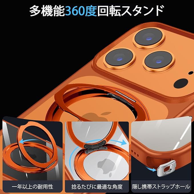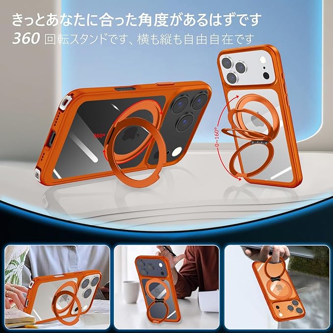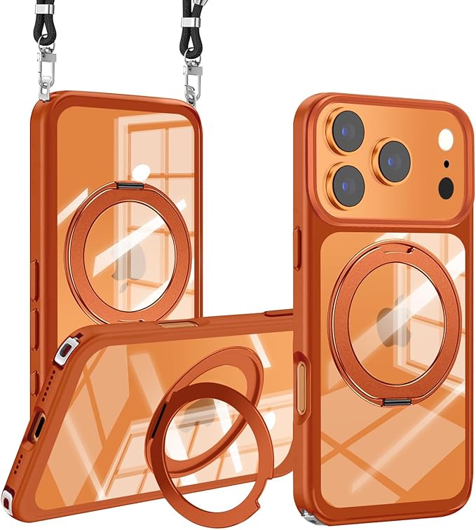 For iPhone 17 Pro Max 用 ケース ショルダー クリア リング付き 透明 MagSafe対応 マグセーフ ワイヤレス充電 スタンド機能 マグネット搭載 スマホケース アイフォン 17 プロマックス ケース シリコン TPU 調節可能 ストラップホール付き 肩がけ 首掛け 紐付き 耐衝撃 全面保護 カバー (オレンジ) | KAZESHOP