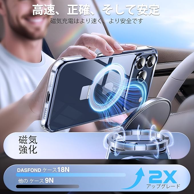 【磁力アップグレード】DASFOND N52磁気リング構造、磁力は公式N48より2倍強力です。アップグレードされたテクノロジーのサポートにより、充電がより安定し、充電時間が短縮されます。また、iPhone 17 pro max magsafe ケースは、すべての MagSafe アクセサリおよびその他の Qi 認定ワイヤレス充電器 (カー マウント、ワイヤレス パワー バンク、磁気ウォレットなど) と完全に互換性があります。