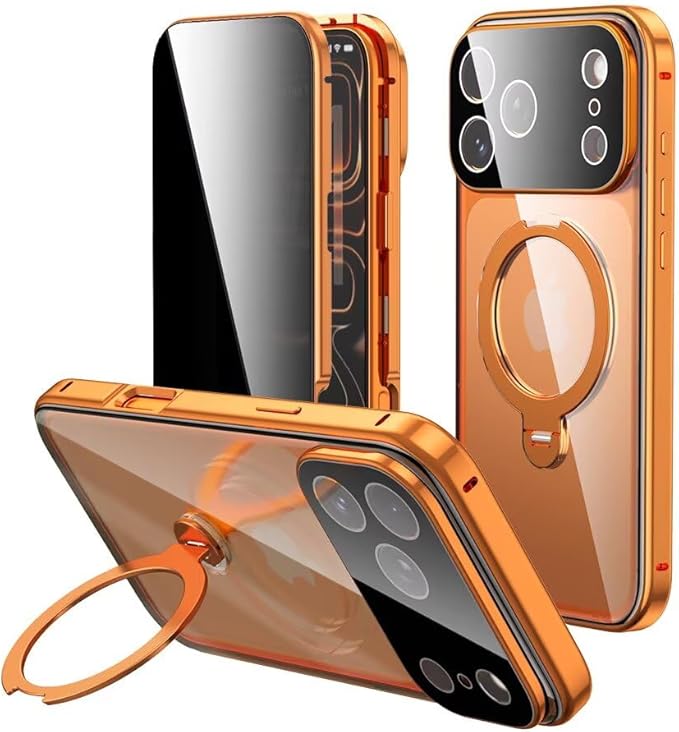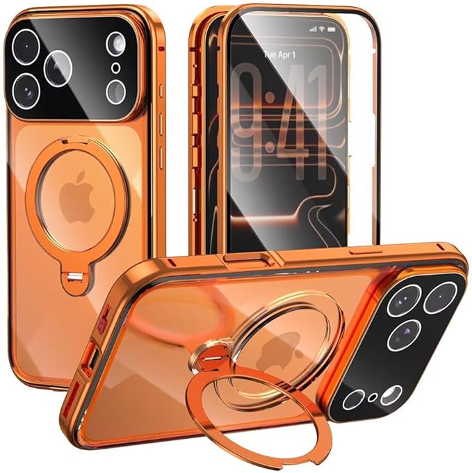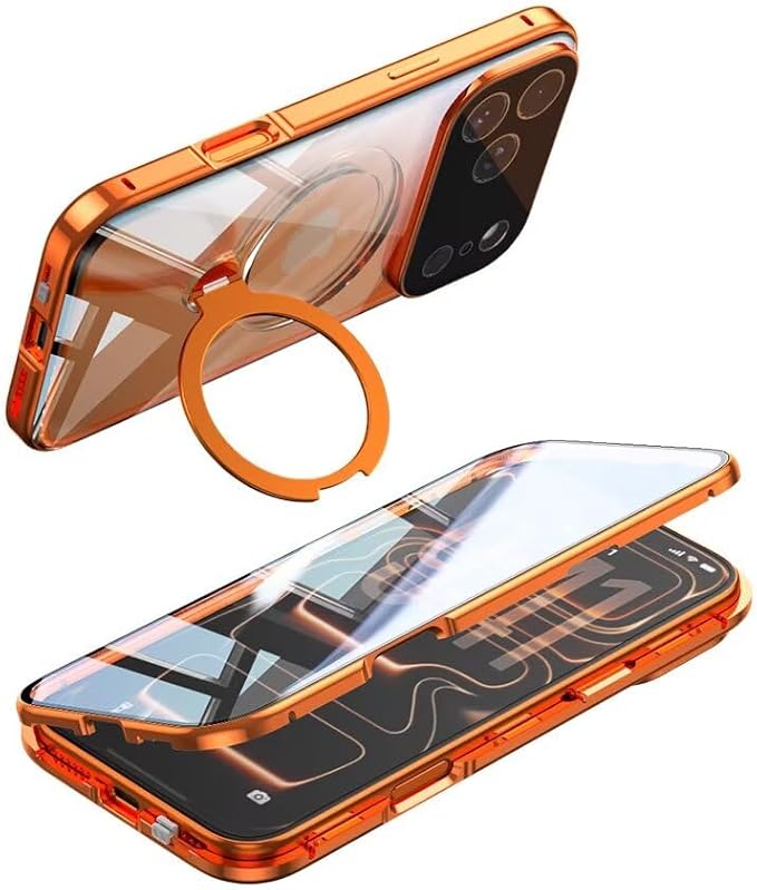 【スタンド機能付き・360 定点回転】MagSafe対応 iPhone 17 Pro Max 用 ケース クリア ロック付き 9H強化ガラス PC背面 一体型レンズ保護 両面 アルミバンパー メタルフレーム ワイヤレス充電対応 アイホン17プロマックス 用 カバー スマホケース,オレンジ | KAZESHOP