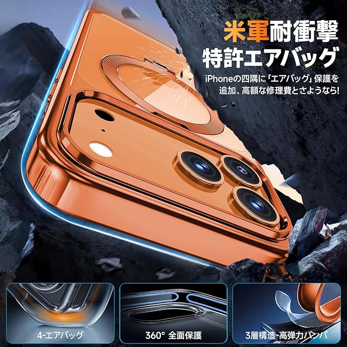 【三重保護セット!コズミックオレンジ限定】OYR iPhone 17 Pro Max用クリア ケース Magsafe 対応[360 回転CD スタンド・10 万回開閉テスト][メッキバンパー・iPhone専属色][カメラ保護とガラスフィルム付き]ストラップホール付き マグセーフ アイホン17プロマックスケース マホケース17 Pro Max 人気 米軍MIL規格・耐衝撃(6.9インチ・オレンジ) | KAZESHOP