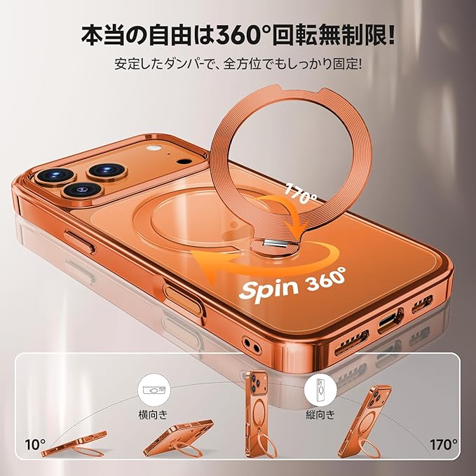 【360 回転!|耐久性・安定性・高級感全て揃えた】 市販品にありがちな「変形」、「緩み」、「安定性がない」などの悩みを、新しい製品にフィードバックして全ての問題を解消した!このiphone 17 promax ケース独自の技術を搭載し、10 万回以上の耐久テストをクリア。材質・形状・加工技術に徹底的にこだわり、市販品に比べて約10倍の圧倒的な耐久性と強度を実現したことにより、リングの部分緩みや破損も一気に解消!このiphone 17 promaxケースは縦 45 直立から横 180 まで角度自在に調節できる。市販のスタンドが横置きを調整できず欠点を完全に解消しました!動画再生やビデオ通話などで、自分好みの角度に簡単に設定できます。カフェで集中作業する際、60 傾けて iPhone を立てると、レポート作成中でもスマホでメール確認が両立。