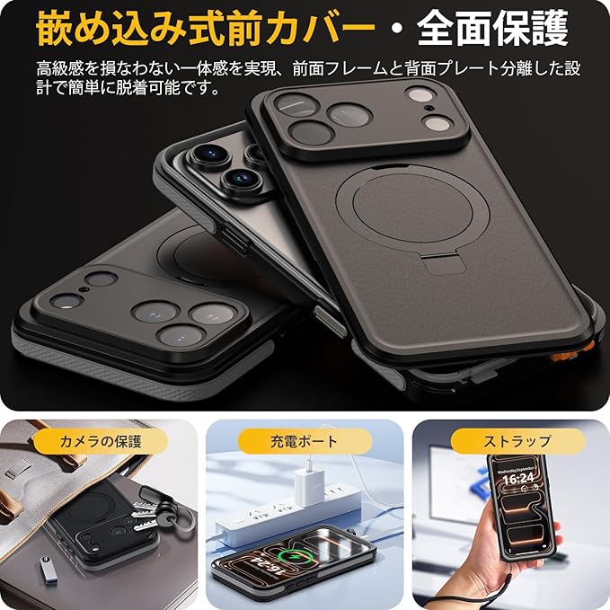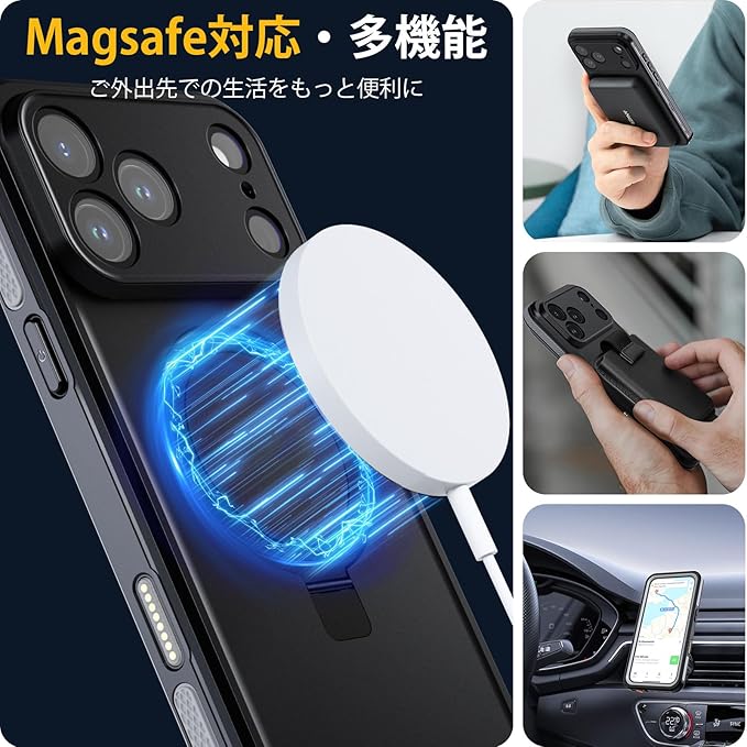 【スタンド機能・MagSafe対応】便利な隠れスタンドはケースと一体型になり、絶妙なデザインで携帯を自由に多角度を調節でき、力よくスマホを支えて、映像や読書などに楽しめることができます。強力なN52マグネットを搭載しており、マグセーフ充電器やその他様々なマグセーフマグネットアクセサリーをしっかりと保持します。また、急速充電可能です、マグセーフアクセサリーとの完全な互換性があり、安心してお使いいただけます。