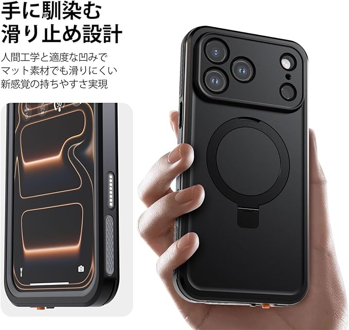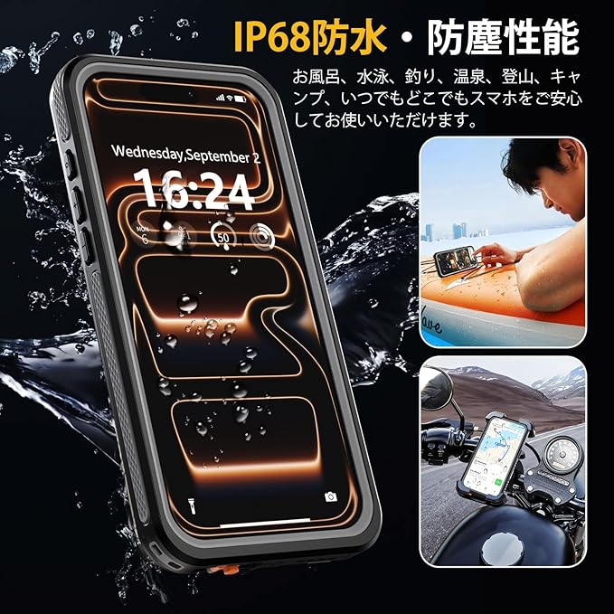 【IP68防水認証取得】iPhone 17 Pro Max 専用の完全防水防塵ケースです。最高防水レベルのIP68認証を取得し、水深さ2Mの水中に1時間まで水没でき、さらに水中撮影でも対応出来ます。防水機能だけでなく、砂・ホコリ・ゴミなどの侵入も防ぎますので、お風呂、水泳、釣り、温泉、登山、キャンプ、いつでもどこでもスマホをご安心してお使いいただけます。