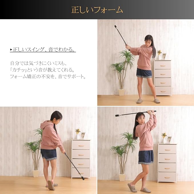 【正しいフォーム】 正しいスイングが、音でわかる。 自分では気づきにくいミスも、「カチッ」という音が教えてくれる。 フォーム矯正の不安を、音でサポート。