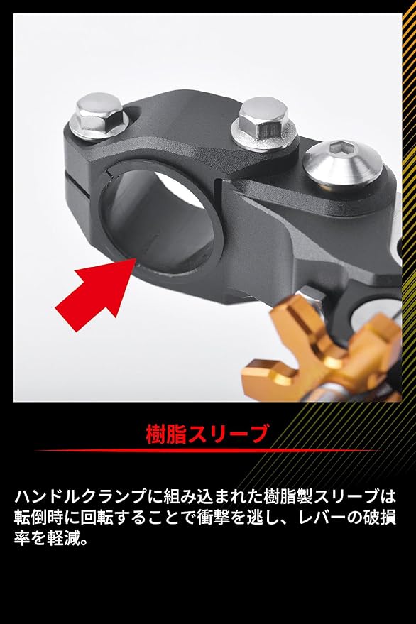 ハンドルクランプに組み込まれた樹脂製スリーブは転倒時に回転することで衝撃を逃し、レバーの破損率を軽減。レバーで破損しやすいピボット部の強度を上げ、転倒時の衝撃に備える。