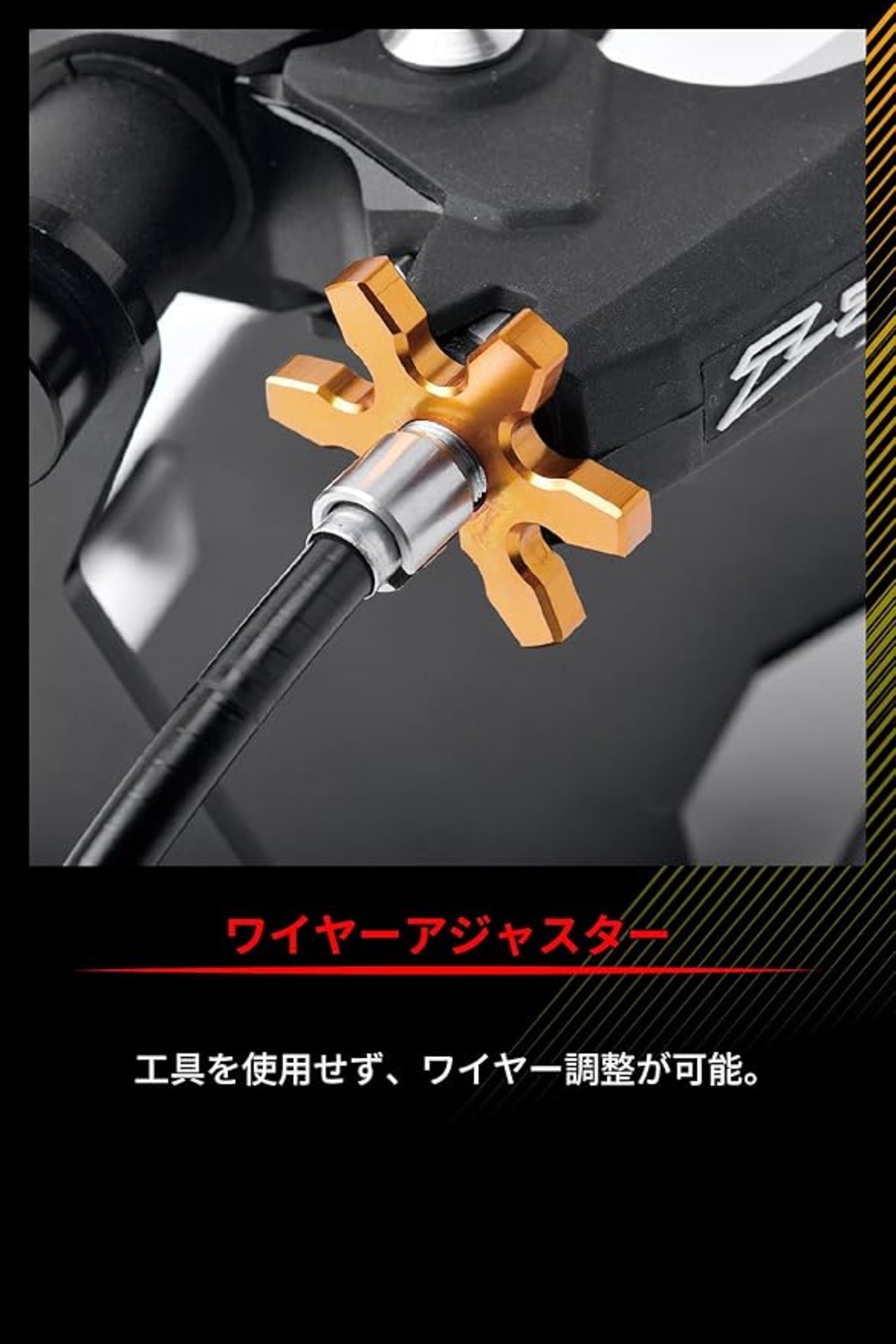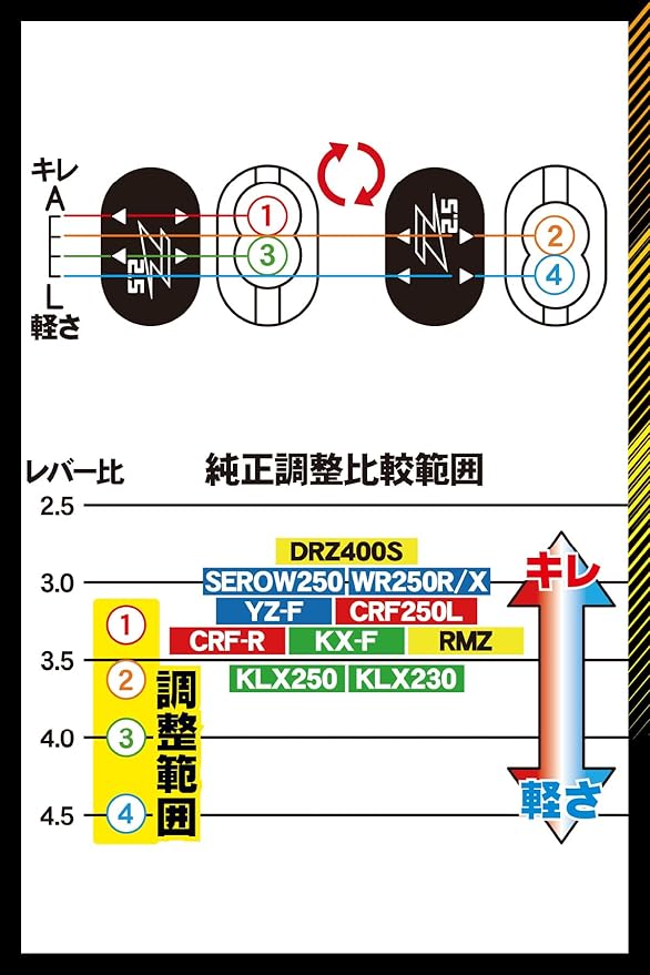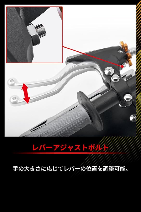 レバーの引きの軽さと、クラッチのキレのバランスを4段階に調整可能。 レバーアジャストボルトにより手の大きさに応じてレバーの位置を調整可能。