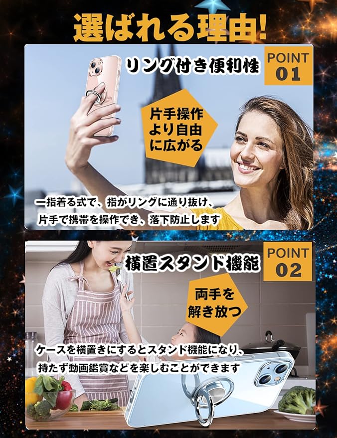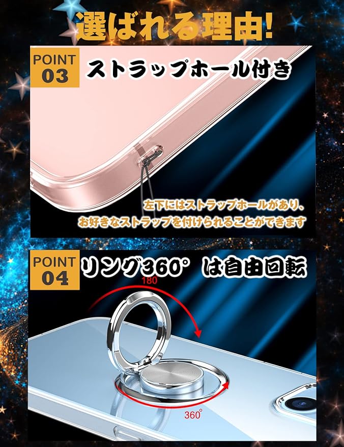 【リング付き機能】ケースを横置きにするとスタンド機能になり、持たず動画鑑賞などを楽しむことができます。リングは360度回転可能、180角度調節可能。一指着る式で、指がリングに通り抜け、片手で携帯を操作でき、落下防止します。