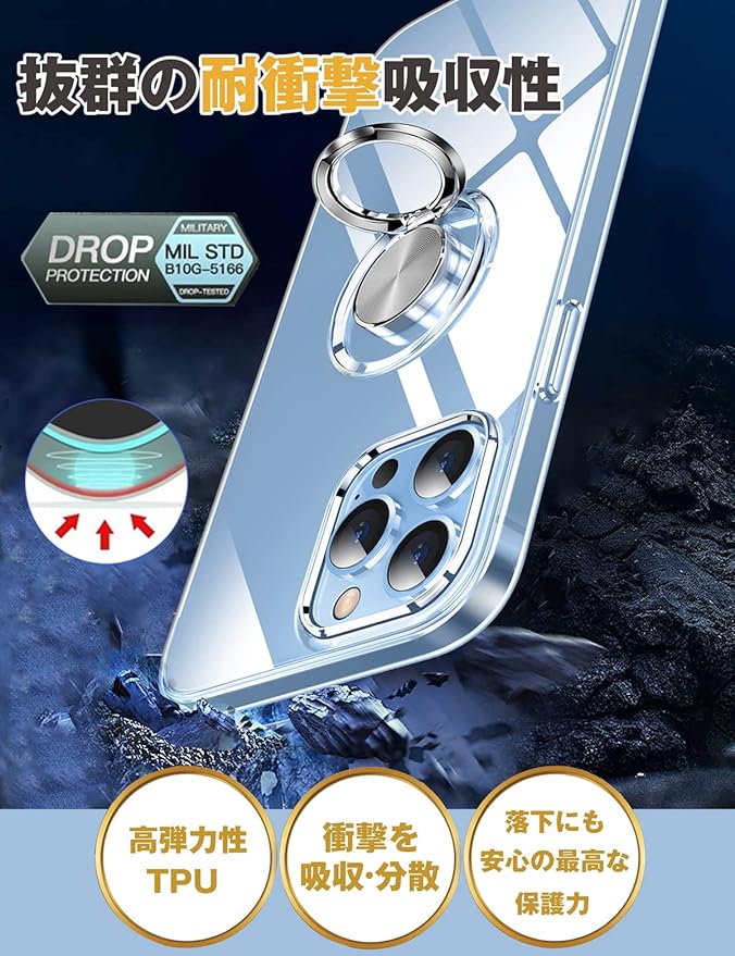 iPhone 13 Pro Max 用 ケース リング付き スマホケース アイフォン 13プロマックス 用 クリアケース 透明 TPU ストラップホール付き 耐衝撃 スタンド機能 車載ホルダー対応 一体型 アイホン13promax 携帯ケース カバー・クリア | KAZESHOP