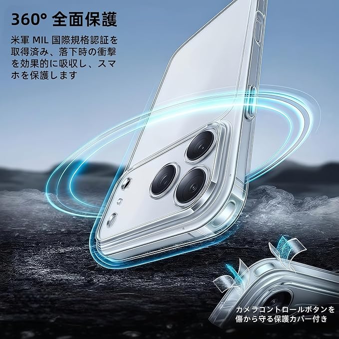 【黄変防止強化素材】高品質 PC 素材とドイツ製バイエル TPU を採用、iPhone 17 Pro Max の美しさを損なうことなく維持。TPU ポリマーに UV 剤を添加し黄変防止力を大幅向上させ、長期使用でも光沢と透明感を保ちます。またワイヤレス充電対応で、急速充電も可能で生活を便利快適にします。