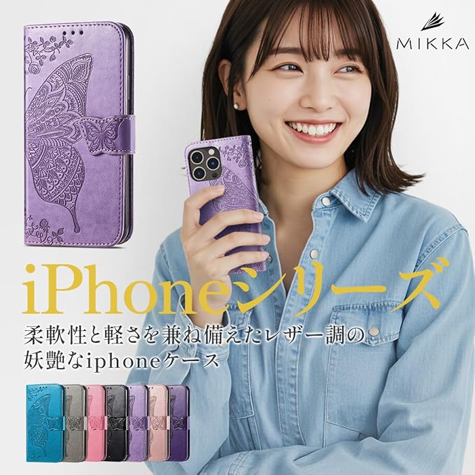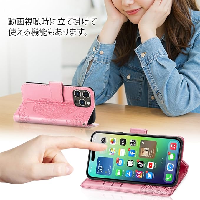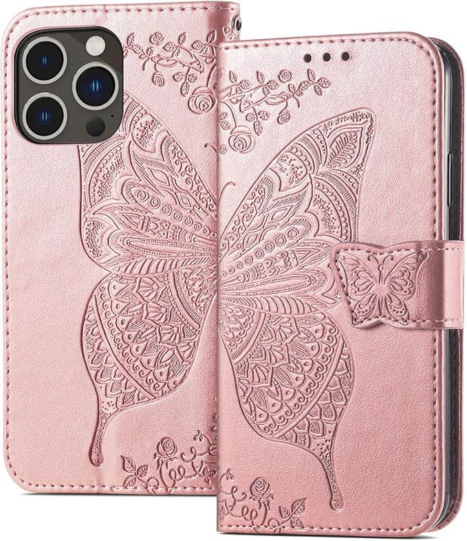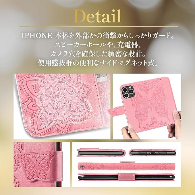 【MIKKA】iphone14 Pro Max用 ケース 手帳型 チョウ 蝶 カード収納 マグネット式 スタンド機能 高級PUレザー エンボス加工 (ピンクゴールド, iPhone14 Pro Max用) | KAZESHOP