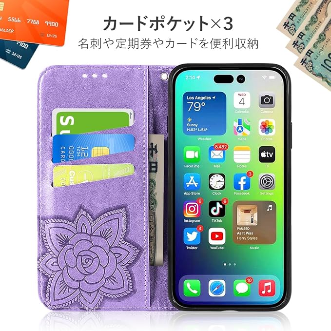 【操作感とスムーズ感】 動画視聴時に立て掛けて使える便利な仕様で使い勝手も抜群です。 カードを3枚収納できるスペース、名刺や、定期券やカードの収納に優れています。