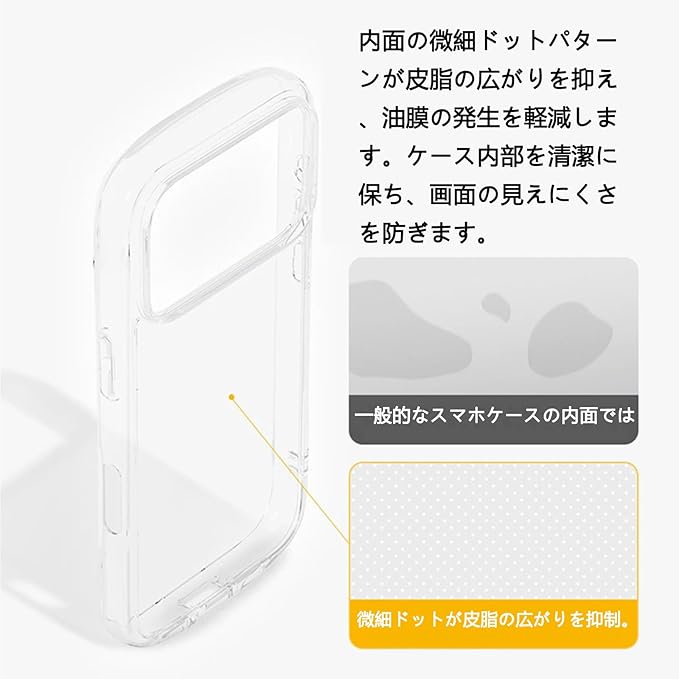 【 水晶のようにクリアな美しさ 】高透明度で黄ばみに強い素材を採用。あなたのスマホの本体の美しい色味やデザインを損なわず、まるで水晶のように澄んだ発色で、その魅力を存分に引き立てます。